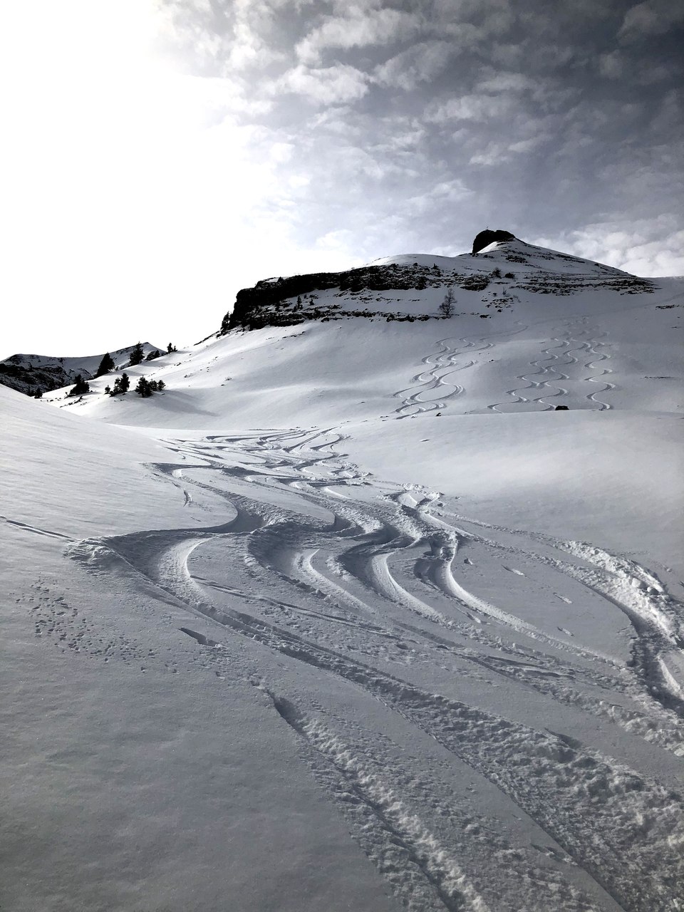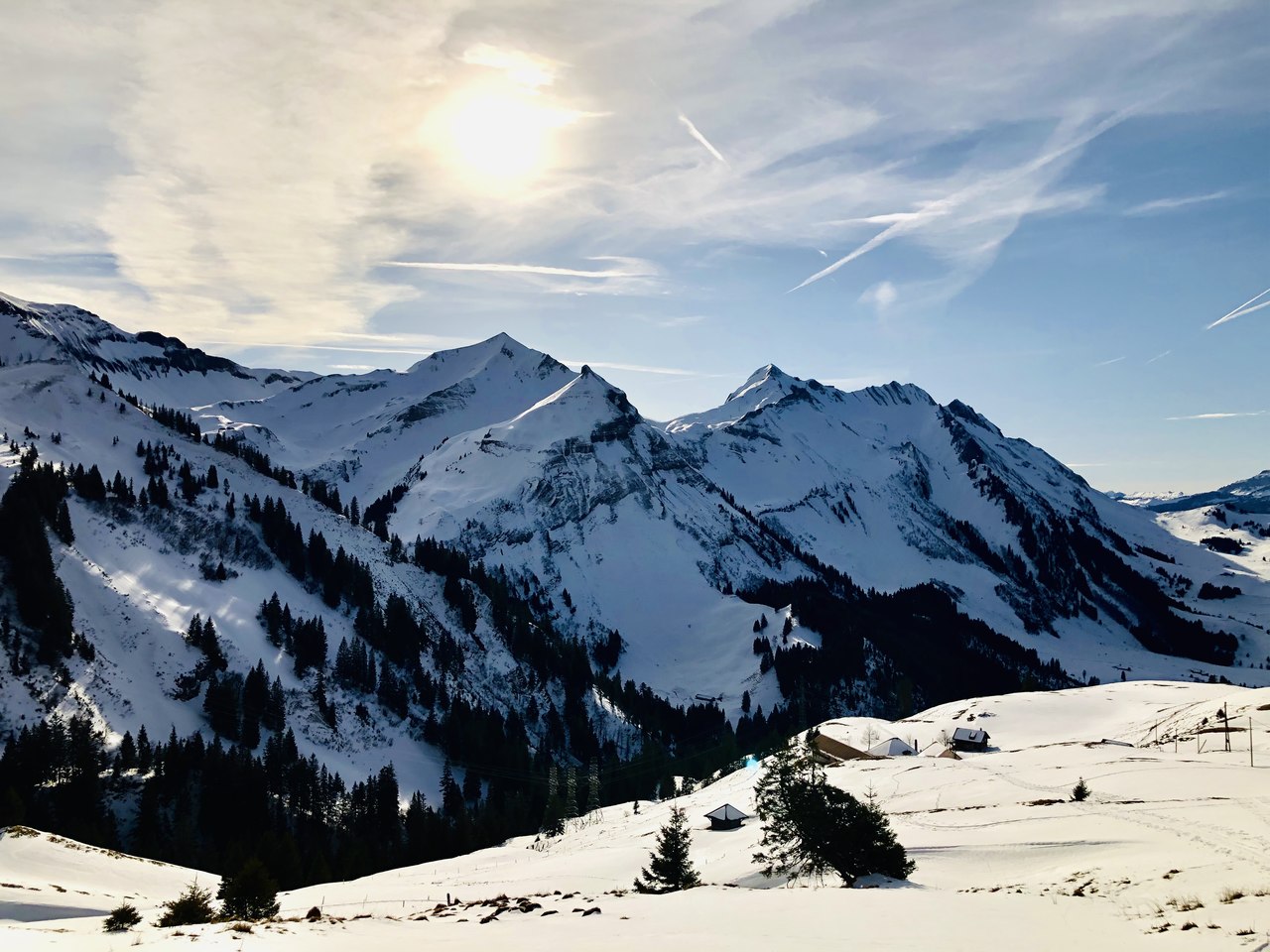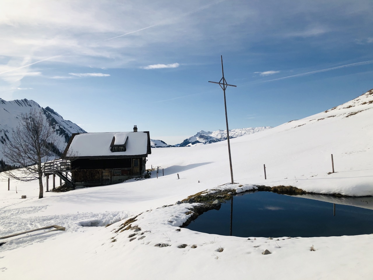 Der Gegenaufstieg führte uns dann vorbei an der schönen Jänzimatt Alp auf ca. 1734 m, wo wir wieder aufs Skigebiet Mörlialp trafen. Dort nutzten wir die Skipiste zur Abfahrt, machten einen kurzen Halt bei der Bar im Skigebiet, tranken auf unseren gelungenen Tag (Dank an Stefan) und fuhren mit der nötigen Vorsicht bis zu unseren zwei Autos, welche auf der Mörlialp auf uns warteten.