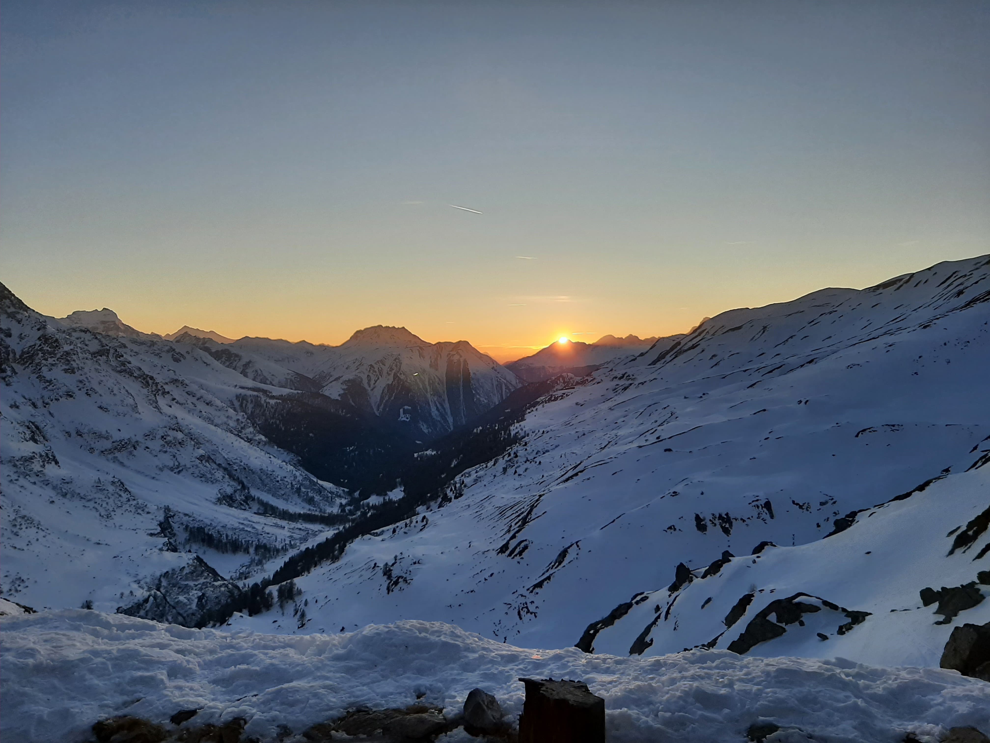 Der Grund für das lange Warten auf dem stillstehenden Autozug blieb unklar. Durch den legendären Tunnel, der Binn der Welt erschloss, gings weiter. In Binn war aber noch lange nicht Schluss. Weiter gings mit dem Auto bis Fäld und noch viel weiter ging es mit den Tourenskiern bis zur Mittlenberghütte auf rund 2300 Meter. Sie sollte unserer Basis für die nächsten paar Tage sein. Die Hütte liegt zuhinterst im Binntal auf einem Felssporn hoch über der unbewarteten Binntalhütte. Mit zugehörigem Bunker wurde sie vom Bund für militärische Zwecke gebaut. In dem Rahmen hat sie bestimmt ausgezeichnete Dienste geleistet. Nun ist sie in privater Hand, ist oft bewartet und bietet 22 Plätze. Sie wurde übrigens im Rahmen der Hüttengeschichten auf SRF portraitiert. Empfangen wurden wir von Caroline, der Hüttenfee und -seele. Nach ein paar klaren Durchsagen realisierten wir schnell, dass Caroline die Hütte trotz Wasser- und Stromknappheit und leichtem Legebatterien-Groove zur absoluten Wohlfühl-Oase verzaubern kann, was wir dann auch bis zum letzten Tag sehr genossen. Wer noch nicht genug vom Aufstieg hatte, zog nach einem kurzen Halt weiter auf den Mittlenberg. Von hier hatte man einen top Überblick übers ganze Gebiet und die bevorstehenden Touren.