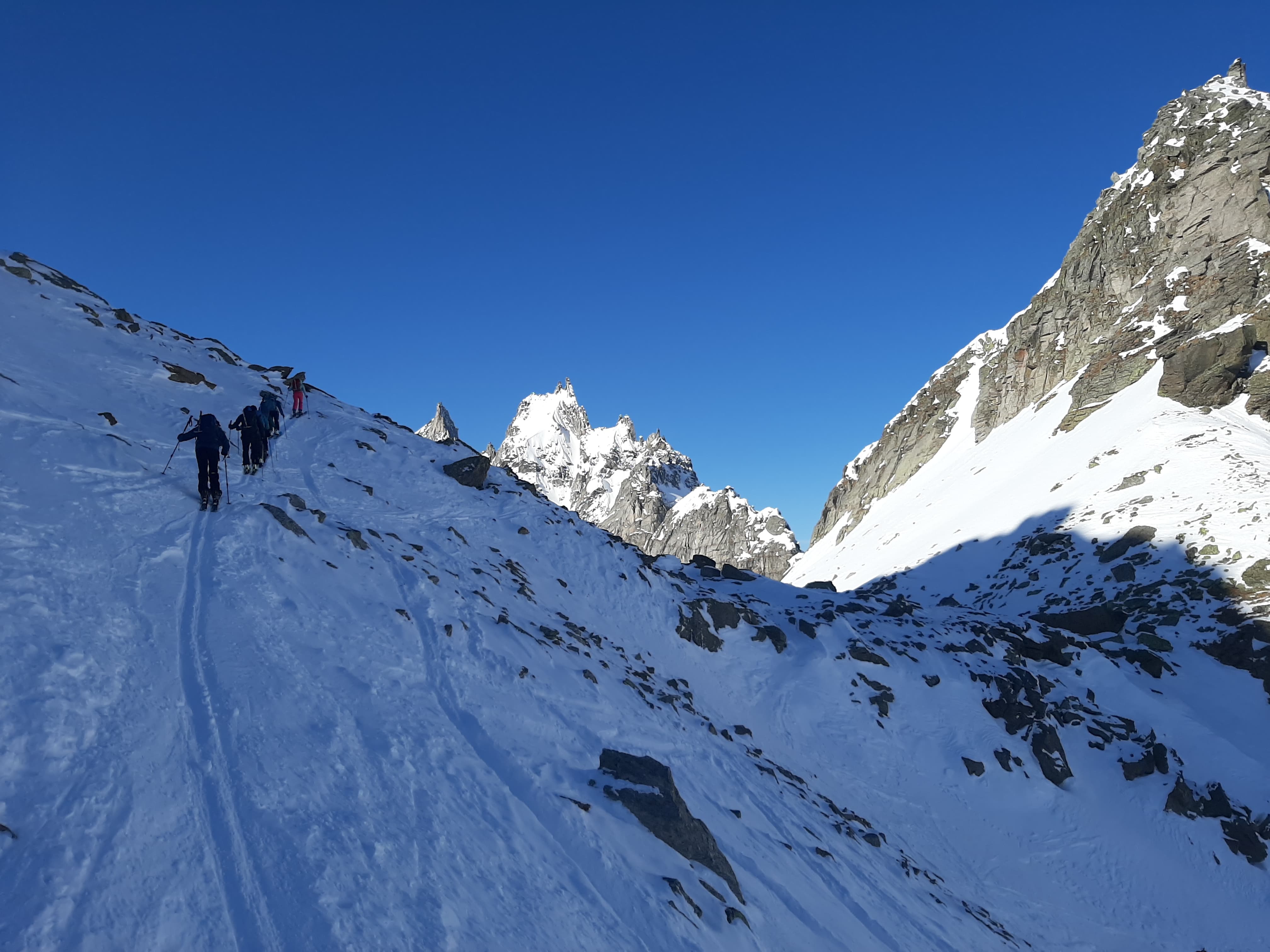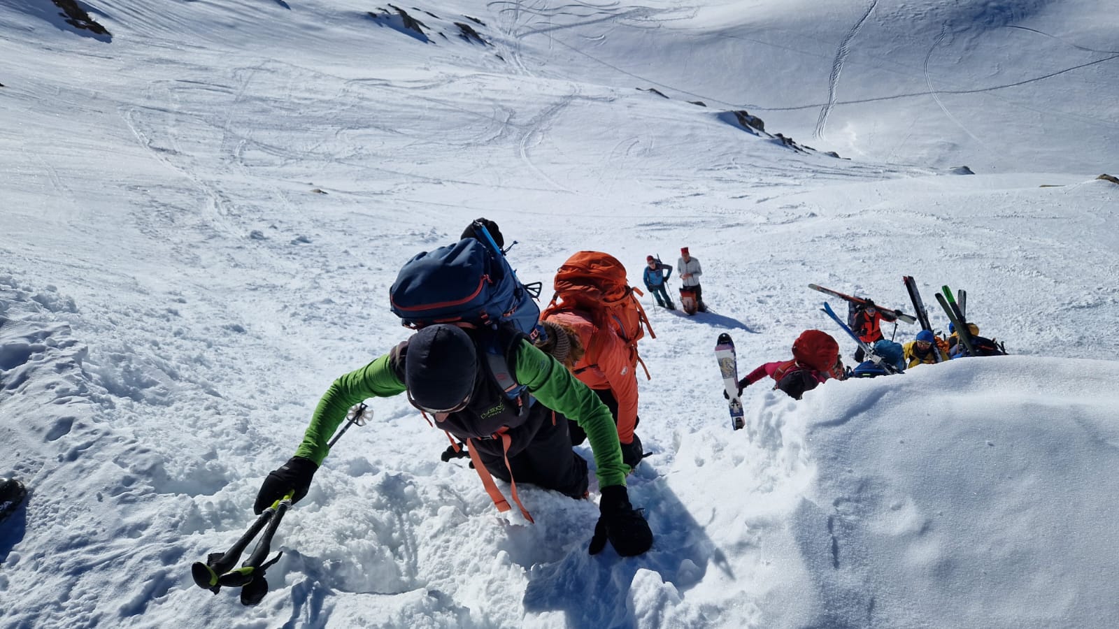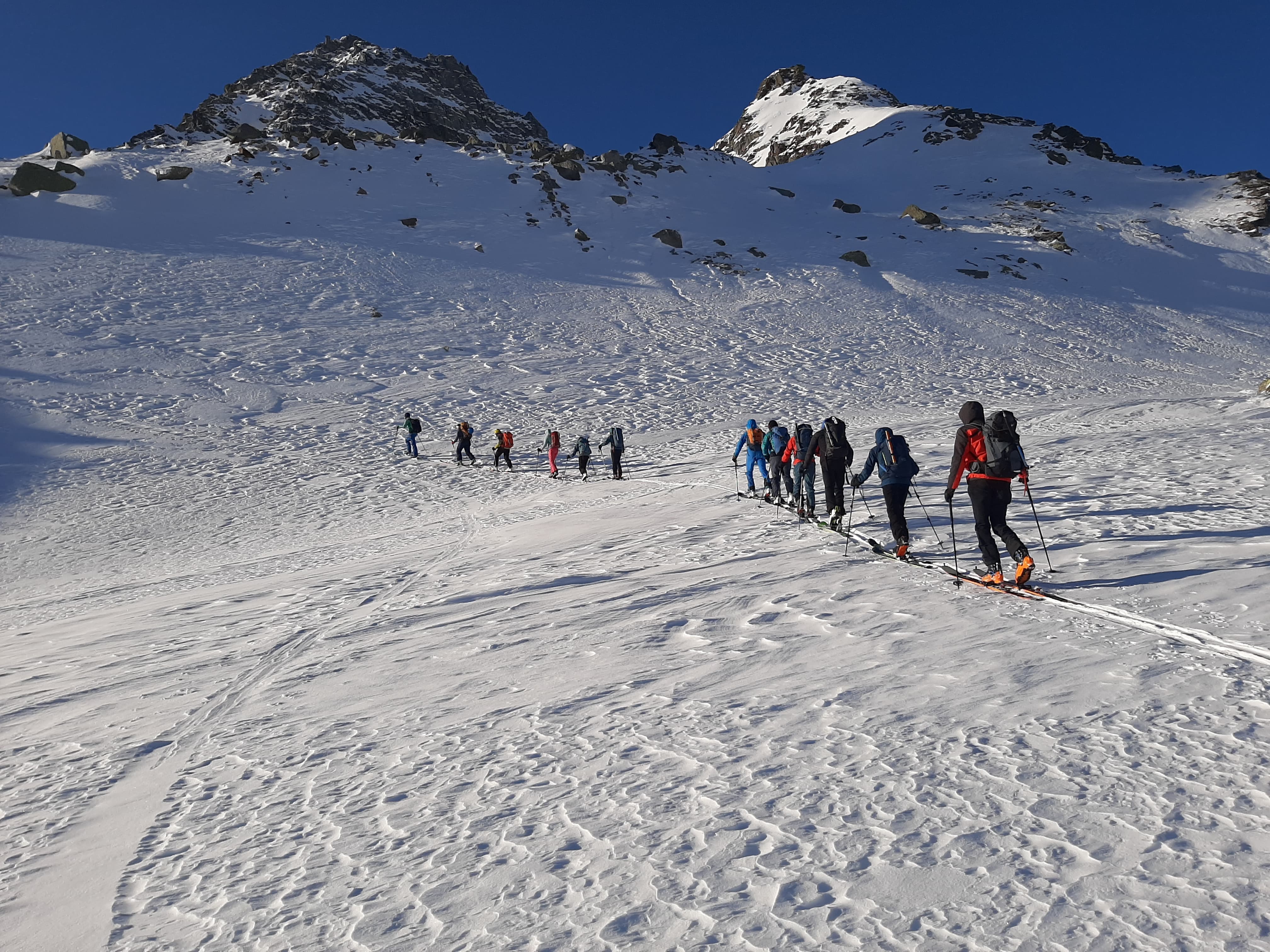 Das Wetter machte an all den Tagen die Tenuewahl einfach. Bei klarem Himmel und steter, zügiger Bise hiess es immer alles anbehalten und, wenns bei den Pausen kalt wurde, noch mehr anziehen. So war es auch am dritten Tag, als wir übers Hohsandjoch wieder nach Italien hinüberwechselten und «von hinten» aufs Ofenhorn aufstiegen. Auch hier wurden für die Abfahrt nicht enden wollende Pulverhänge aufgespürt, was die Mühen des Aufstiegs schnell vergessen liess. Allein vereinzelt auftauchende Steine vermochten dabei die rassige Fahrt von Einzelnen von uns zu stoppen.