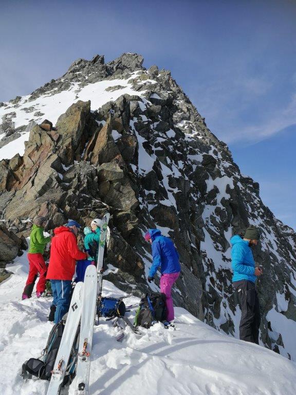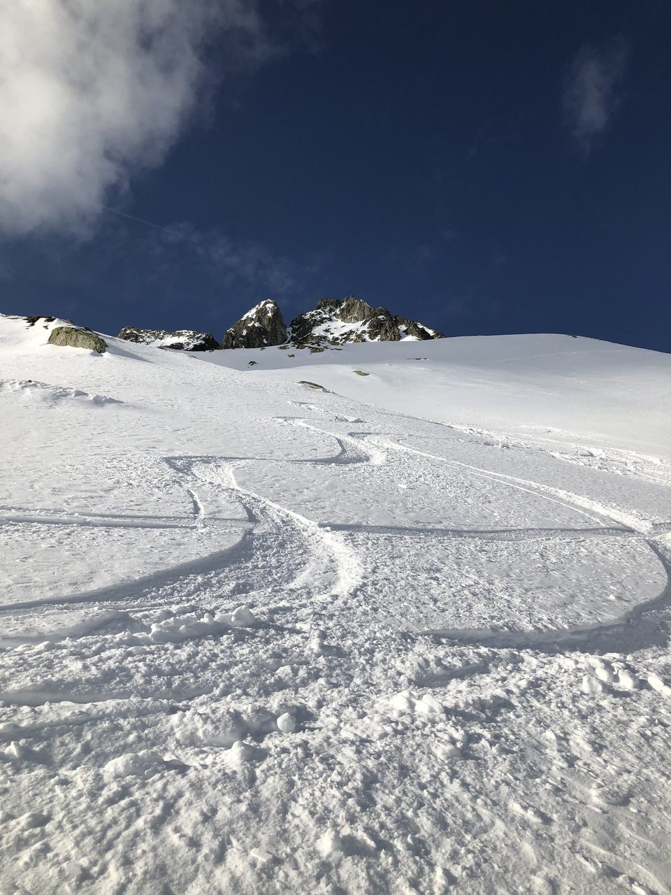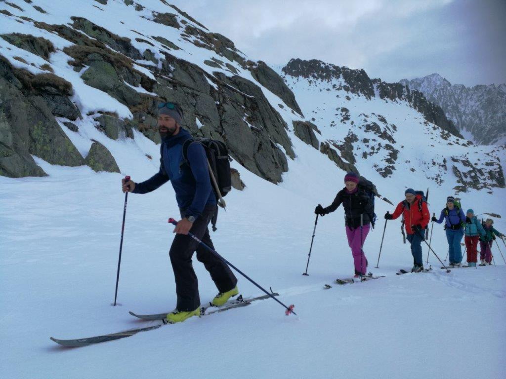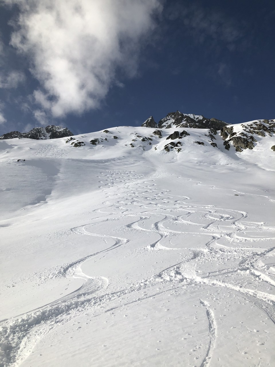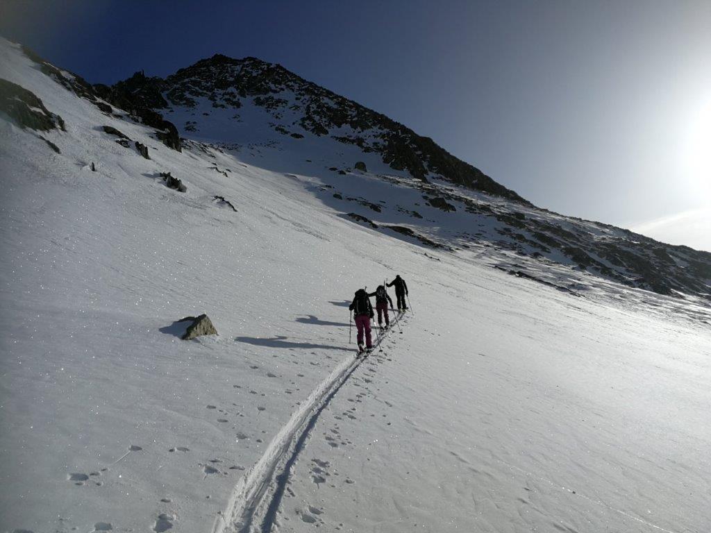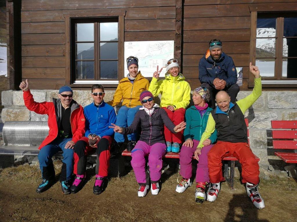Am Sonntag nach dem Frühstück machten wir uns um 7.15 Uhr auf den Weg zur Pörtlilücke durch das Hinteretzli/Hinterspillaui. Der Teamgeist in unserer Gruppe war immer wieder zu spüren und die erfahrenen Teilnehmer unterstützen die Anfänger – an dieser Stelle ein grosses Dankeschön an alle! Je später der Morgen wurde, je besser zeigte sich das Wetter. Die Wolken verzogen sich nach und nach und so kam die Sonne beim Aufstieg Zwärchten hervor. Nach der Abfahrt zurück bis Müllersmatt stand uns der letzte Aufstieg der zwei Tage bevor. Im Schatten machten wir uns auf den Weg zur Mittelplatten. Reto führte uns zu den Osthängen, die noch komplett unbefahren waren und so genossen wir die tolle, lange Abfahrt oberhalb der Crest da Nossadunnaun durchs Val Mila bis nach Rueras.